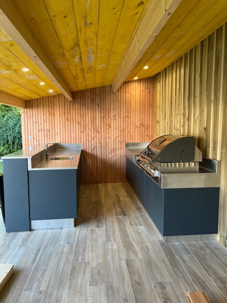 • La cuisine d’été est totalement mobile ou démontable : les meubles, plans de travail et équipements (plancha, barbecue, réfrigérateur) sont simplement posés au sol, sans ancrage permanent. Ce type d’installation offre une grande liberté d’évolution et permet de repenser l’aménagement au fil des saisons.